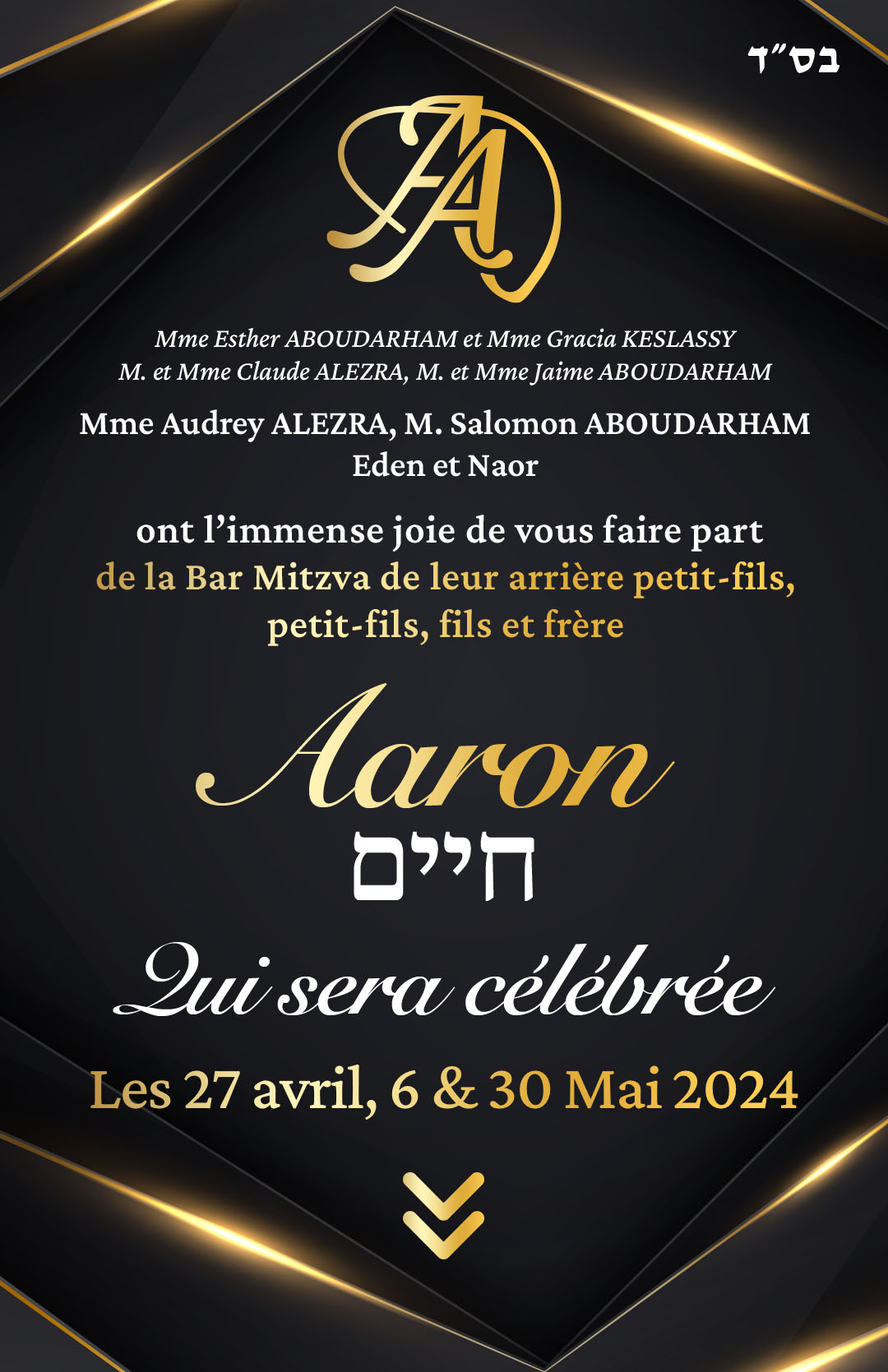 Nous avons le plaisir de vous convierà la Mise des Téfilines d'AaronLundi 6 Mai 2024à 8h00à la Synagogue de Vanves 15 place Etienne Jarousse 92170 VANVESUn petit déjeuner suivra l’office